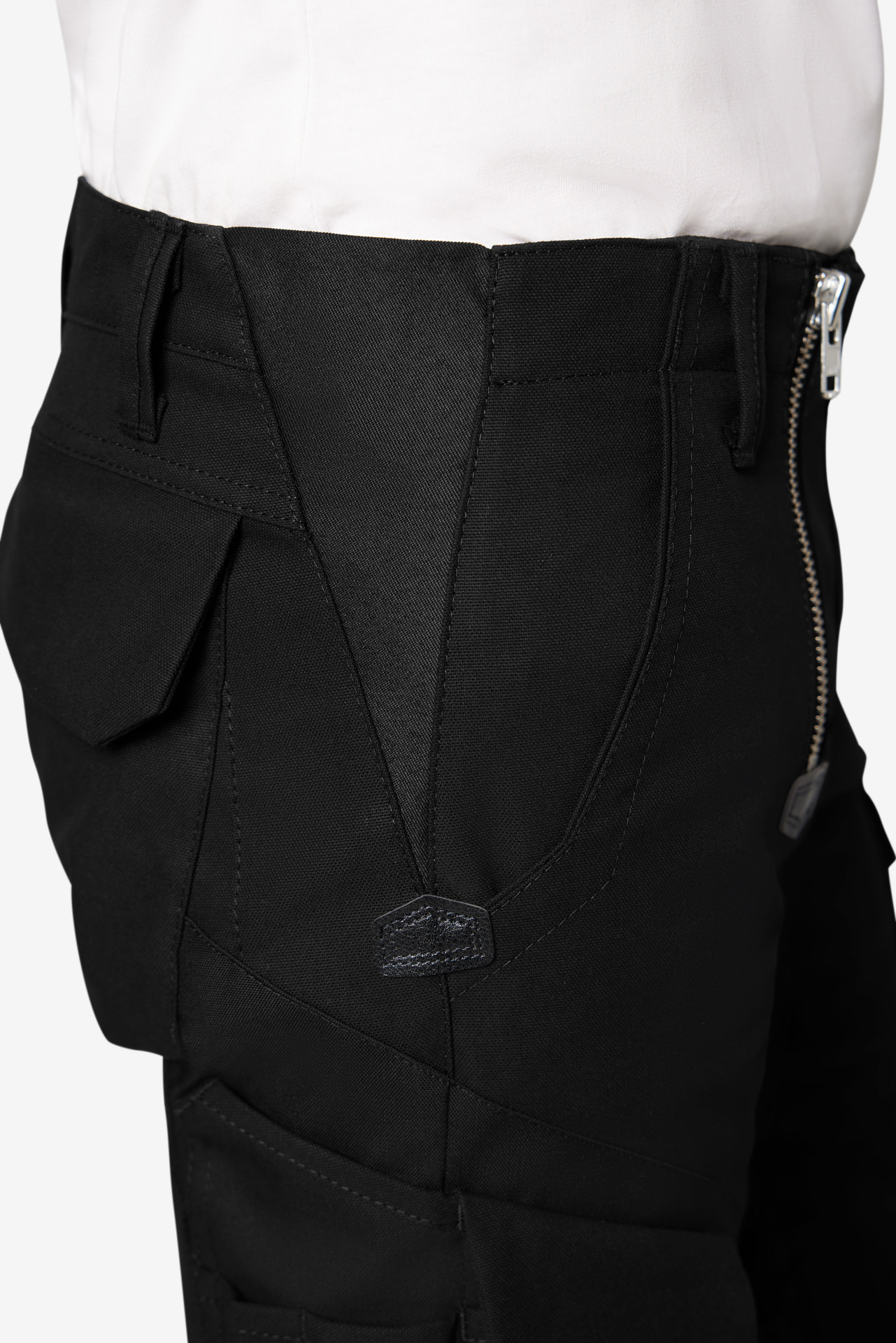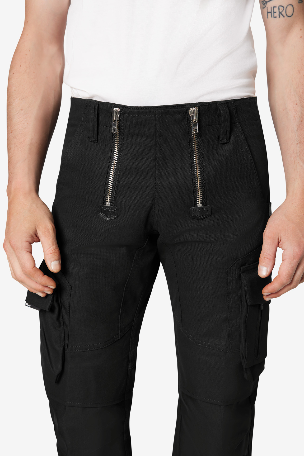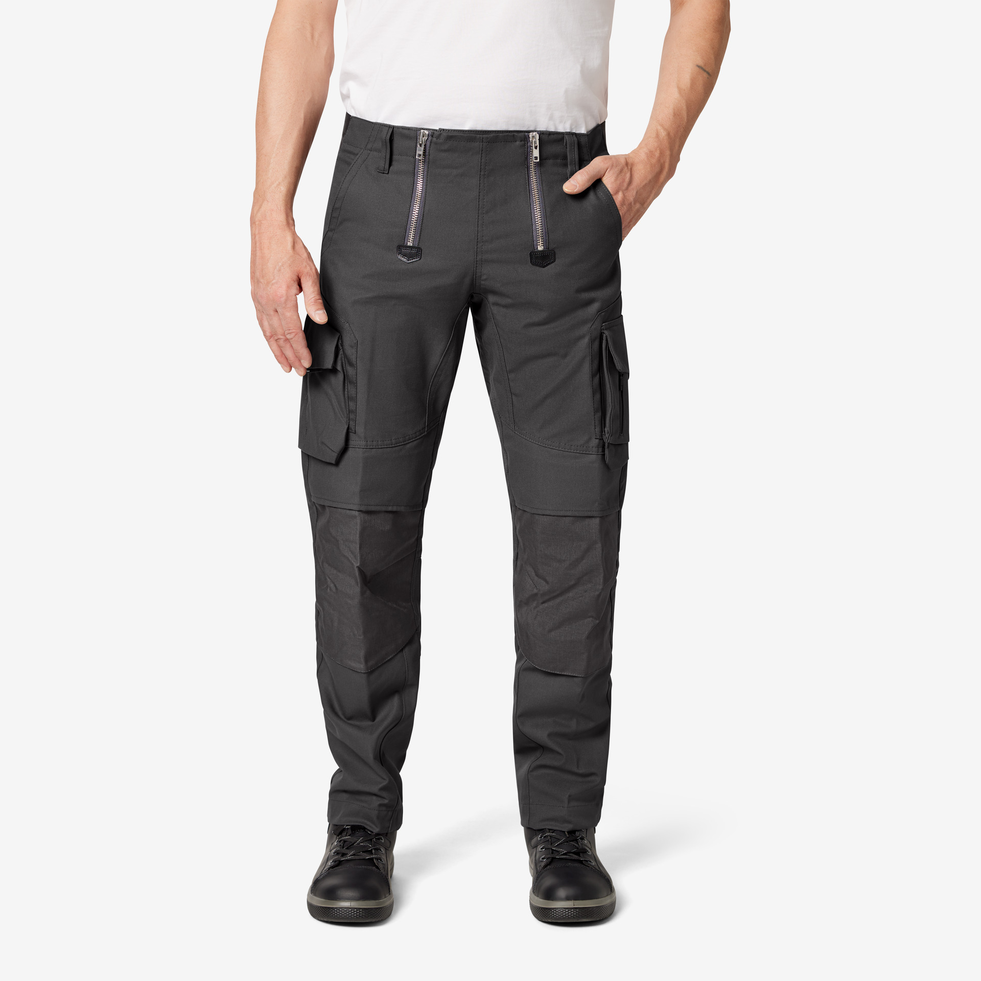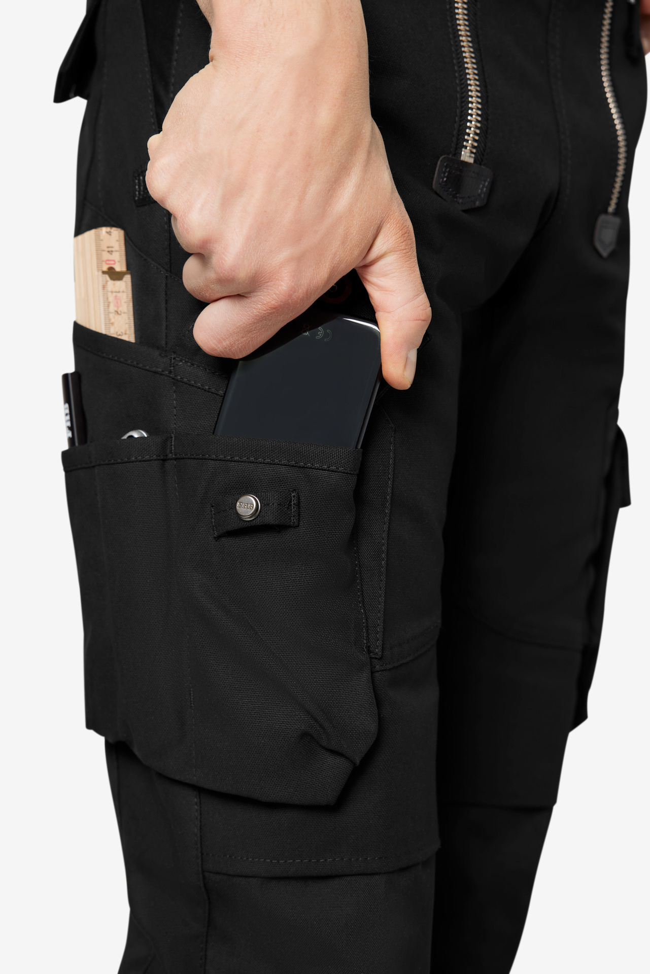 Extrem strapazierfähige Worker-Jeansshorts mit dehnbarem Hosenbund durch robuste Strickeinsätze an den Seiten. Gürtelschlaufen, Hosenknopf und Reißverschluss. Patch am hinteren Bund und ergonomisch vorgeformte Passform. Zwei Einschubtaschen, rechts mit zusätzlicher Sicherheits-Reißverschlusstasche. Zwei Gesäßtaschen mit Stickerei, rechts mit Patte und Klettverschluss. Zwei Cargotaschen mit multifunktionellen Unterteilungen, verschließbar mit Patten und Reißverschlüssen. Aufgesetzte Zollstocktasche auf der rechten Seite. […]